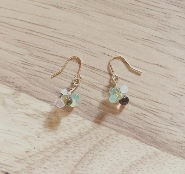 人気の粒々シリーズのピアスです。 ぱっと華やか だけど不思議と上品でナチュラルな印象です。 蝶々が羽ばたいているように見えることから、てふてふと名付けました。 ガラス部分: 約1cm 色: エメラルドグリーン&透明