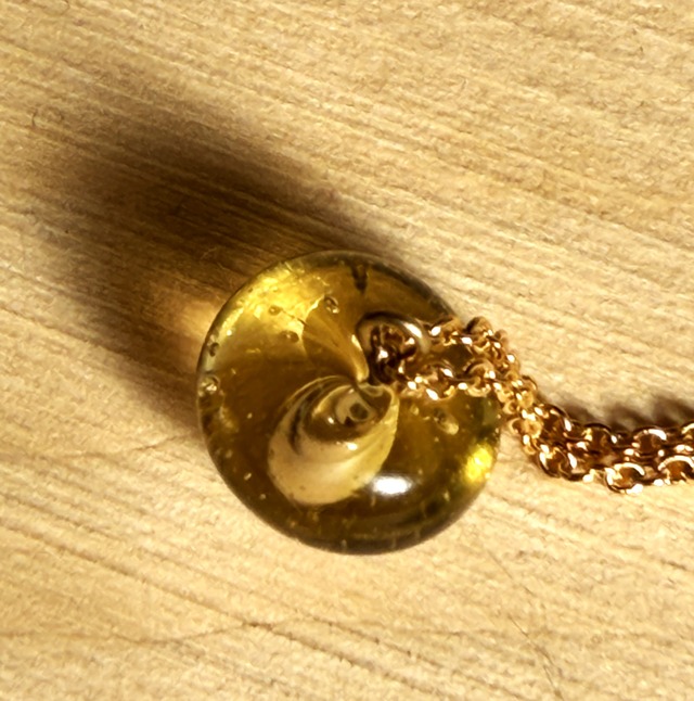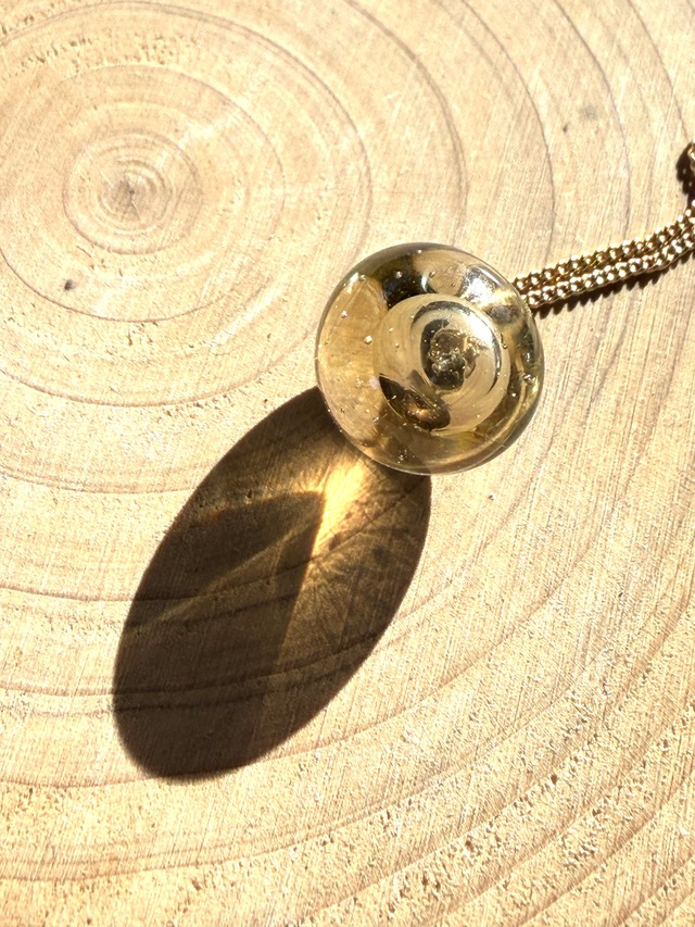 シンプルな一粒のネックレス 空気の泡をつつみこんだ 泡沫(うたかた)シリーズ 光が角度によっていろんな表情を見せてくれる美しい粒 萌黄色と山吹色が混ざり合ったこちらの粒は、あたたかな光を放ちます。 ガラス部分:約0.8cm の球体 チェーン:約41cm アジャスター:5.5cm 商品番号【UK02】