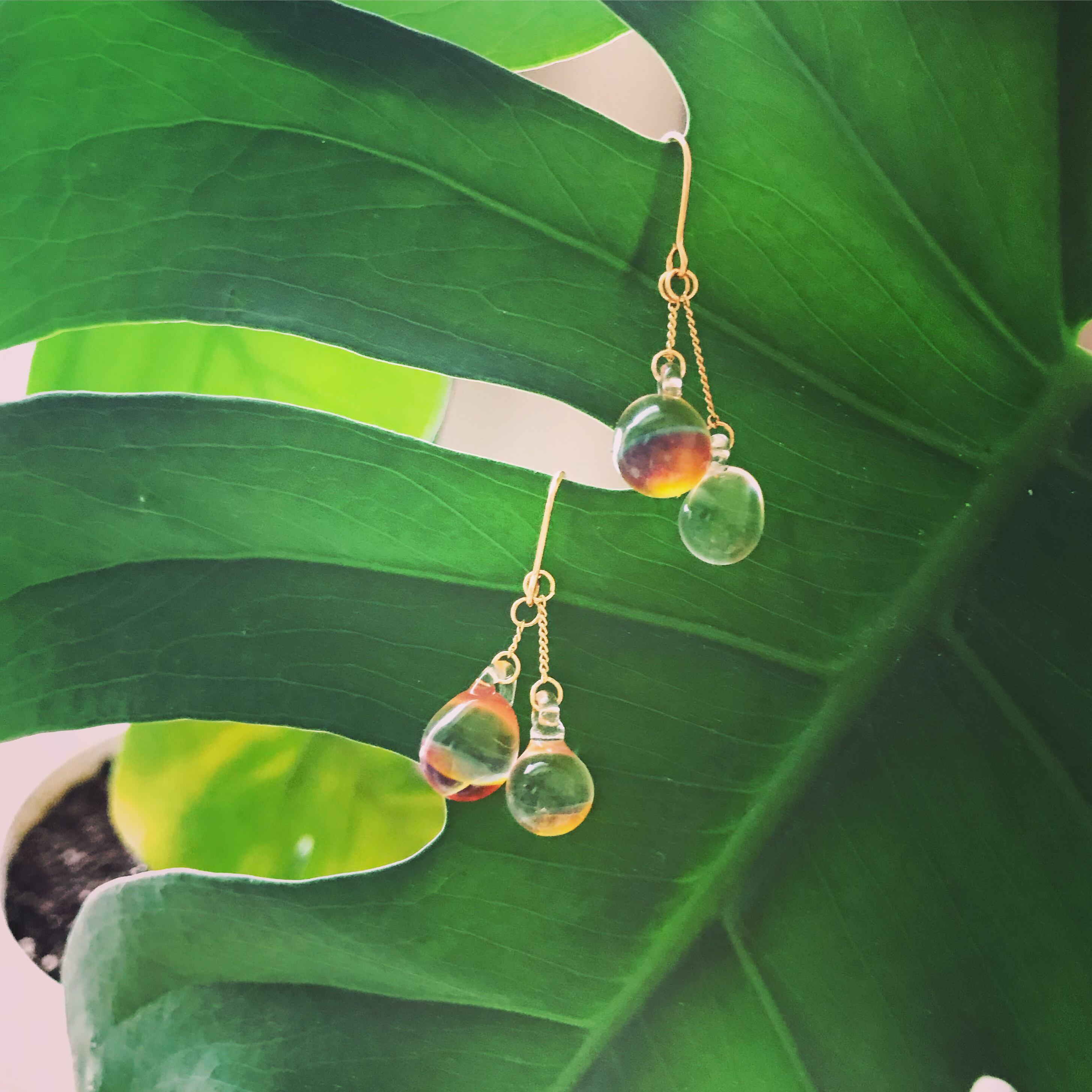 オレンジ、イエローの暖色系の色の入ったティアドロップ型のピアス