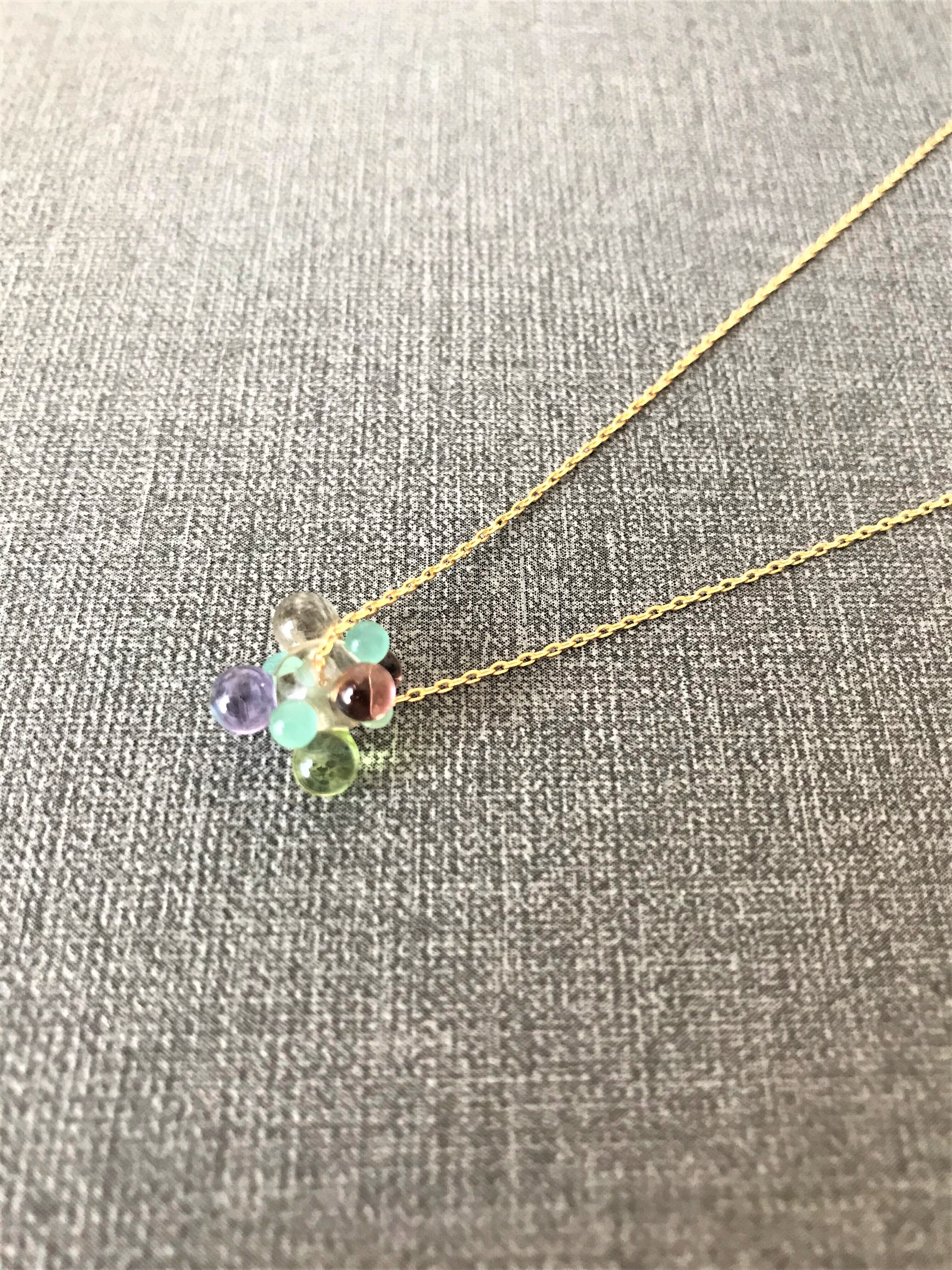 色とりどりのガラス粒と短めで細いチェーンの組み合わせた華奢な印象のネックレスです。