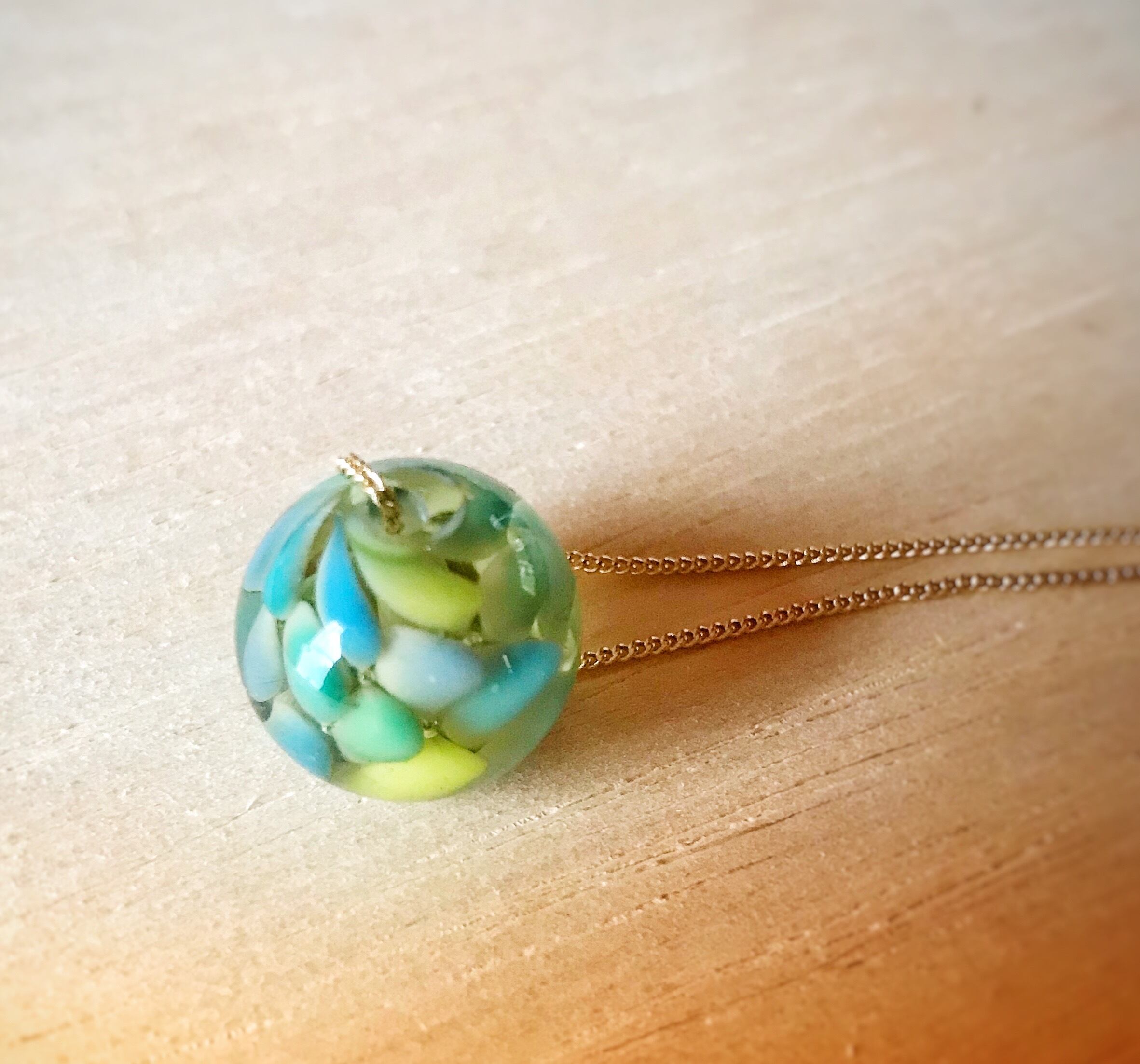 阿蘇の人気スポット、湧水が勢いよく湧き上がる白川水源をイメージしたとんぼ玉をネックレスに仕上げました。